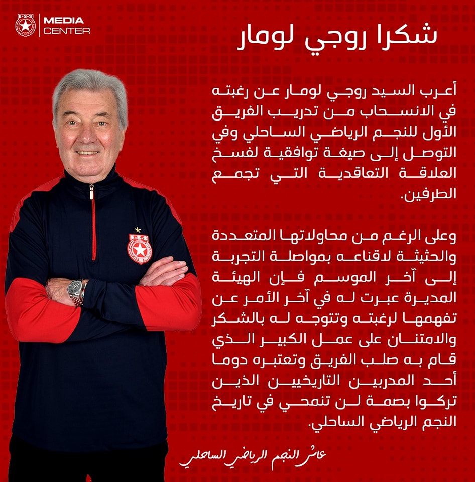 Le club a indiqué qu’il remercie Roger Lemerre pour tout le travail effectué et a souligné que les responsables ont fait de leur mieux pour le convaincre de rester, mais sa volonté personnelle était plus forte.