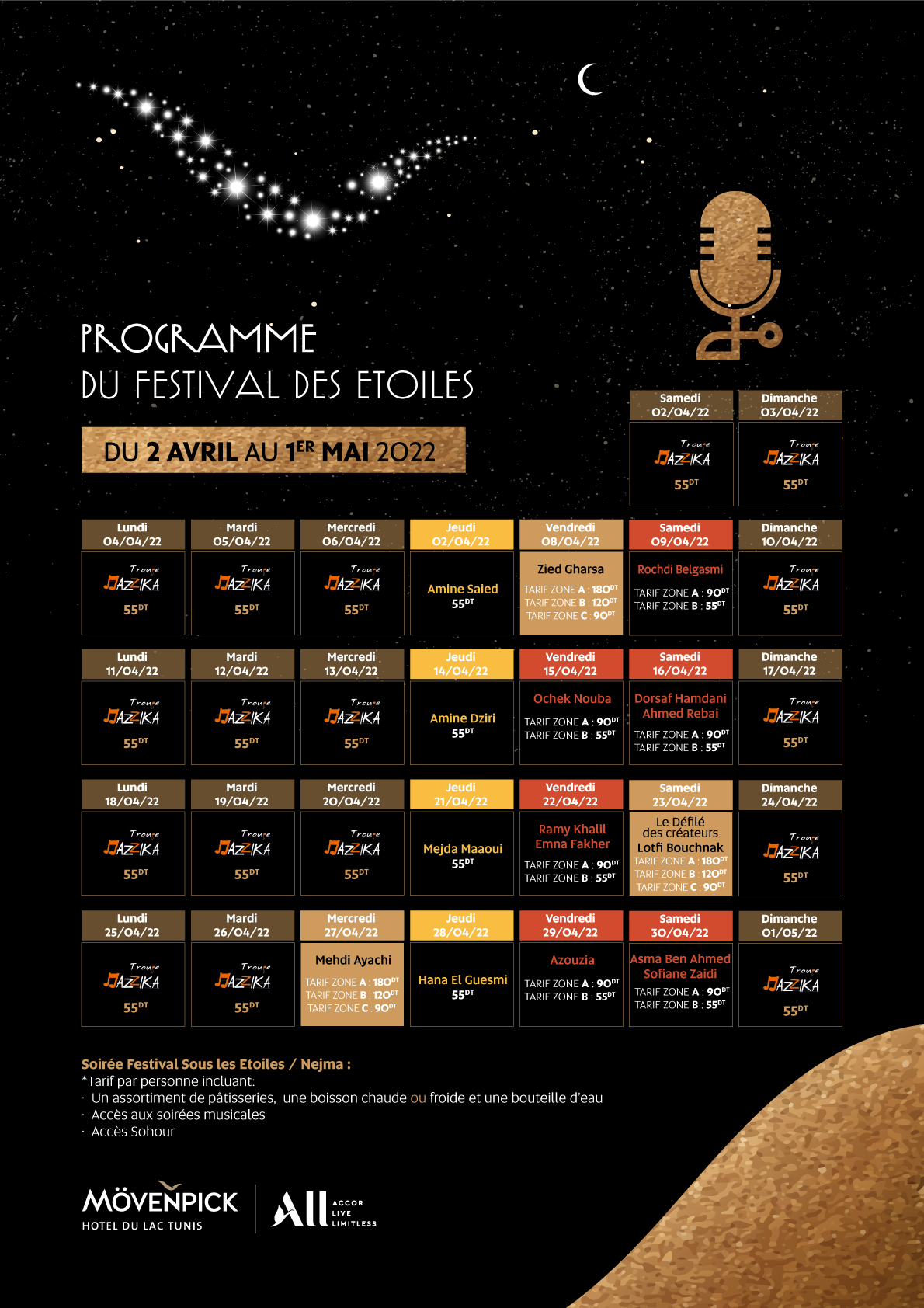 Cette 4ème édition du Ramadan sera rythmée par le Festival des Etoiles, le 1er Festival musical et artistique organisé au Mövenpick Hotel du Lac Tunis qui accueillera plus de 250 artistes, musiciens, chanteurs, chorégraphes sur 30 jours de fête.