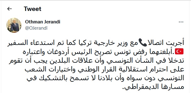 Le ministre dit 'avoir informé son homologue ainsi que l’ambassadeur turc, du rejet par la Tunisie de la déclaration d’Erdogan ', la considérant comme 'une ingérence dans les affaires tunisiennes '.