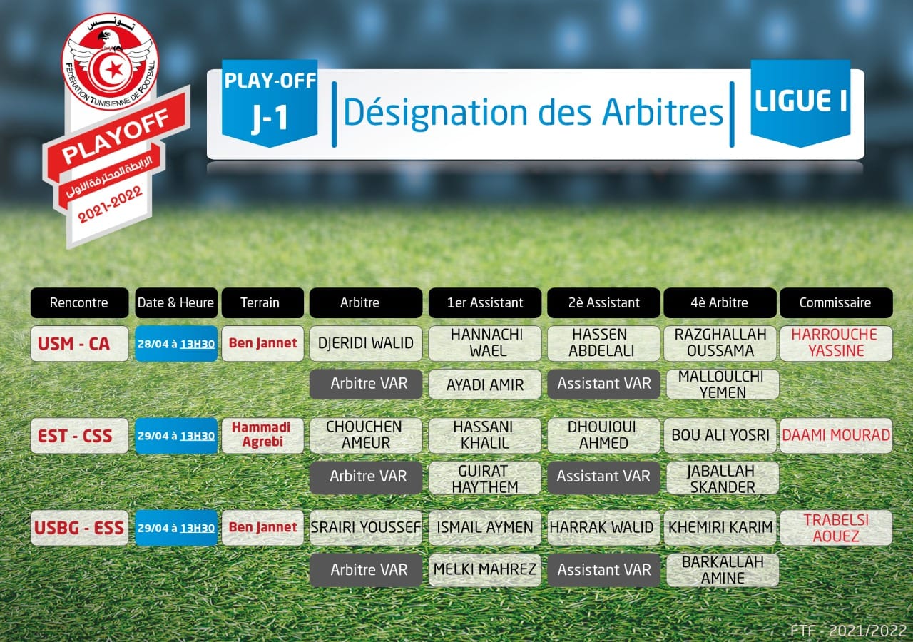 Voici les arbitres des matchs de la 1ère Journée des play-off du de la ligue I prévue le 28 et le 29 avril :