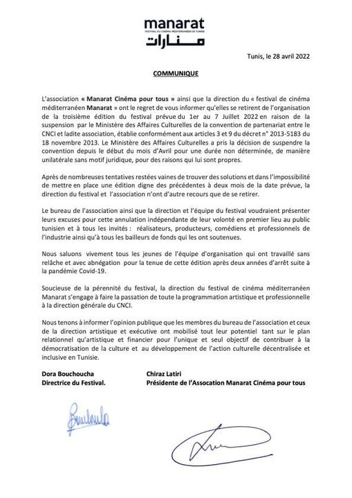 L’association "Manarat Cinéma pour tous " ainsi que la direction du " festival de cinéma méditerranéen Manarat " ont le regret de vous informer qu’elles se retirent de l’organisation de la troisième édition du festival prévue du 1er au 7 Juillet 2022 en raison de la suspension par le Ministère des Affaires Culturelles de la convention de partenariat entre le CNCI et ladite association, établie conformément aux articles 3 et 9 du décret n° 2013-5183 du 18 novembre 2013.