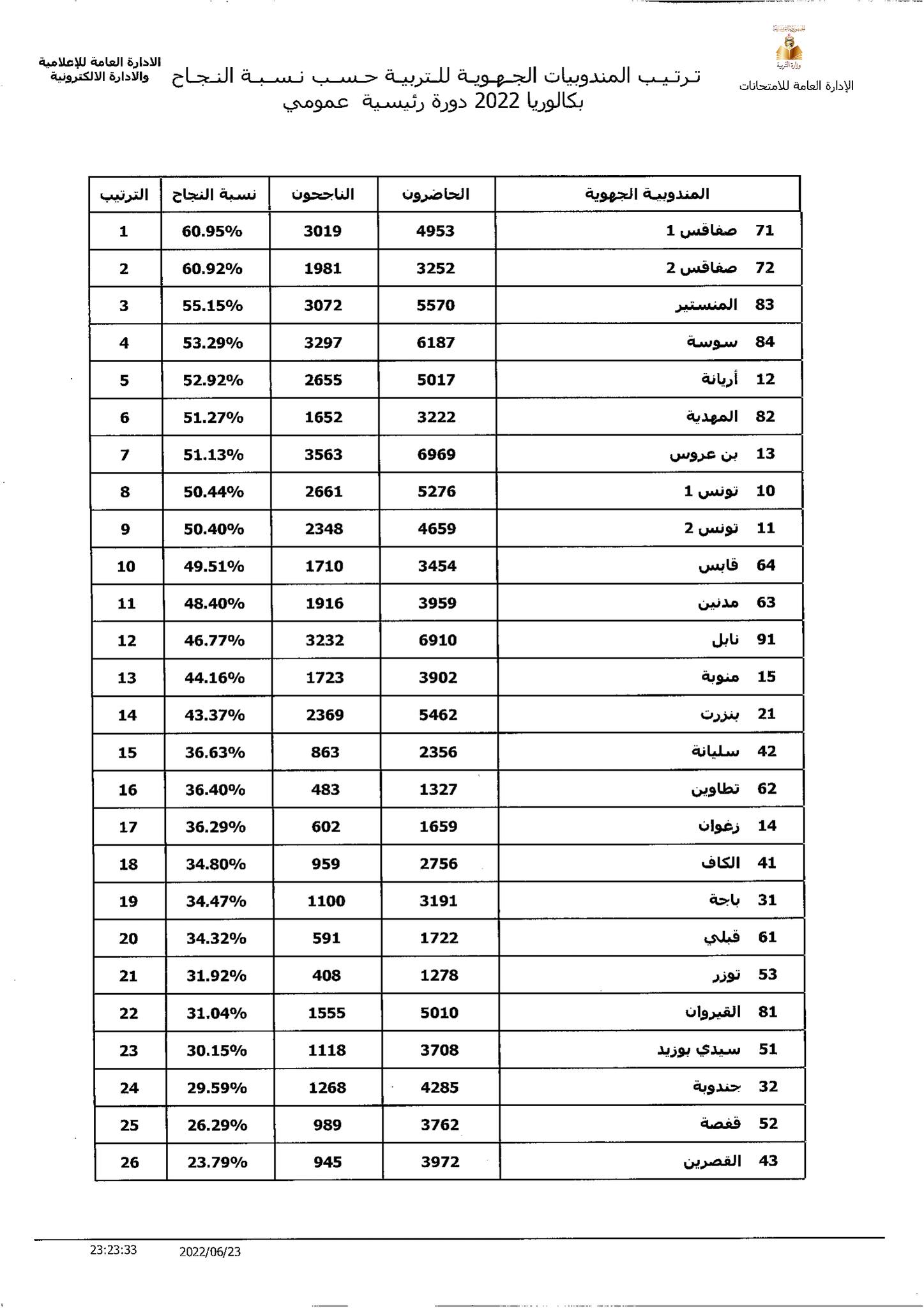 La ville de Sfax occupe la première place, avec un taux de réussite de 60,95% à Sfax 1, suivie de Sfax 2 avec 60,92%.