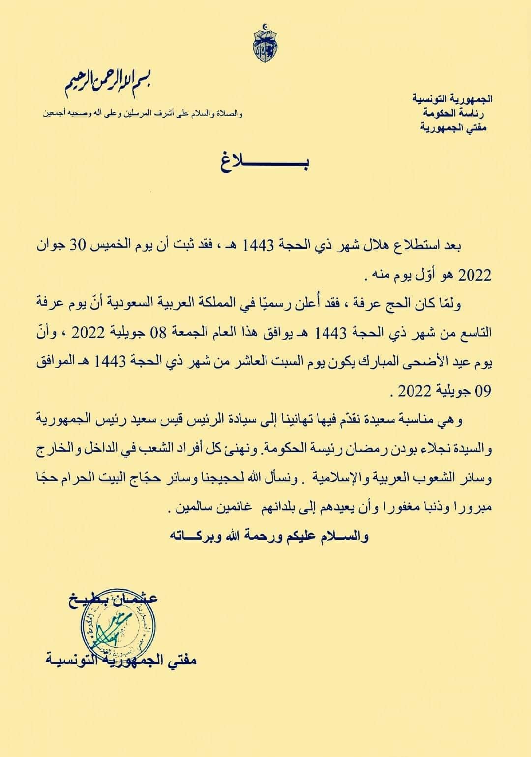 L’Aid Al Idha (Aid el kébir) sera célébré cette année le samedi 09 juillet 2022, indique un communiqué du Diwan Al-Ifta, signé par le Mufti de la République Othman Battikh.