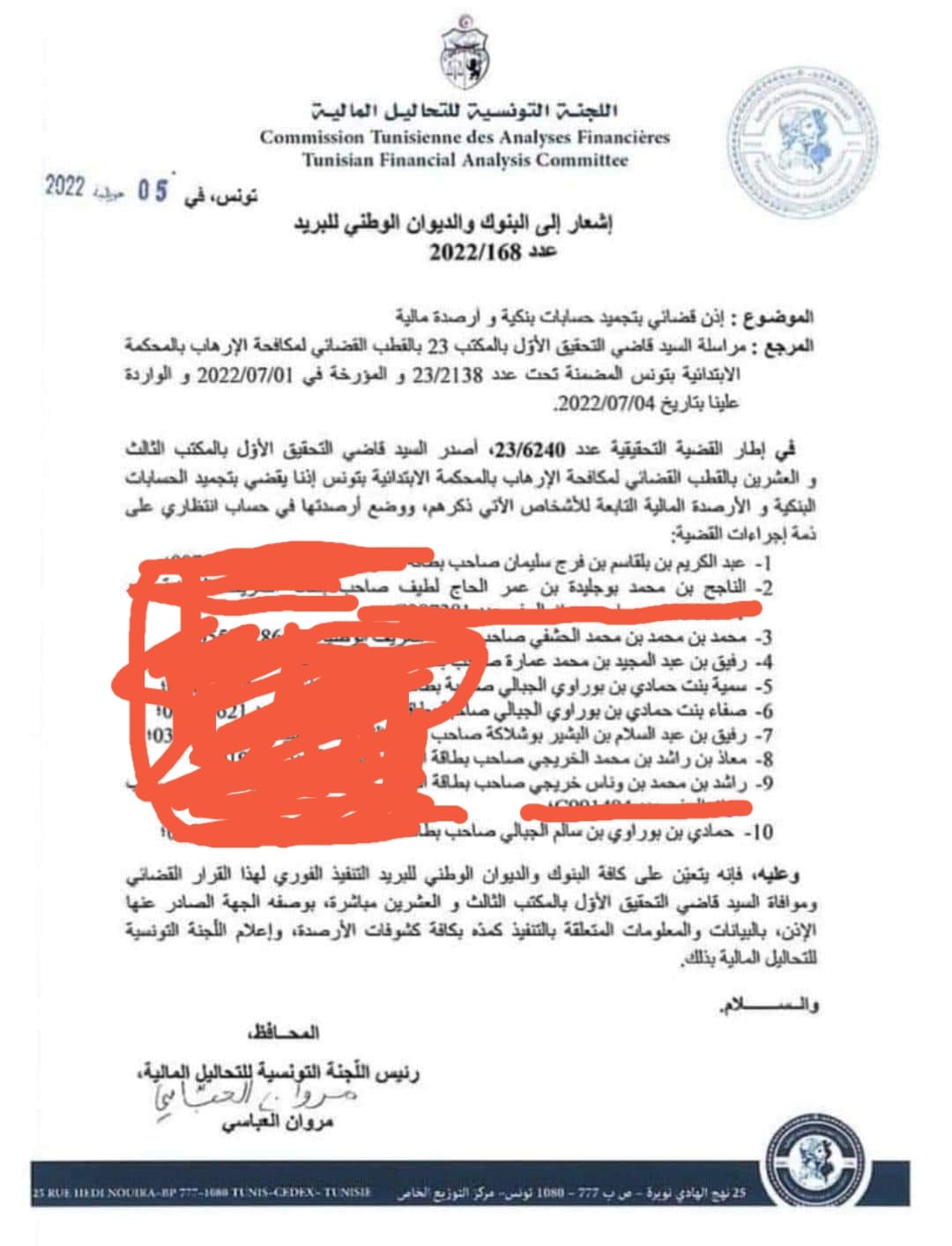 Le premier juge d’instruction du bureau 23 du pôle judiciaire de lutte contre le terrorisme près du tribunal de première instance de Tunis a adressé hier, lundi, une correspondance à la commission tunisienne d’analyses financières (CTAF), au sujet d’un ordre judiciaire émis par le juge en question le 01er juillet courant, portant sur le gel des comptes bancaires et des avoirs financiers de dix personnes, tout en les consignant dans des comptes en instance, à la disposition des mesures judiciaires.