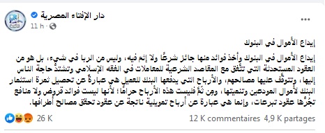 Dar Al-Ifta d’Egypte, l’institution de jurisprudence religieuse, considère que « le dépôt de l’argent dans les banques, tout en en récoltant les intérêts est licite, n’est pas un péché et n’a rien à voir avec l’usure الربا. "