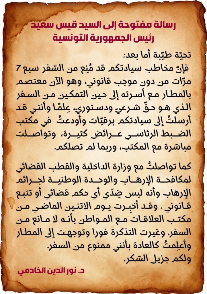 L’ancien ministre des Affaires religieuses, Noureddine Khadmi, annonce être en sit-in avec sa famille à l’aéroport de Tunis-Carthage, pour avoir été empêché de voyager 07 fois.