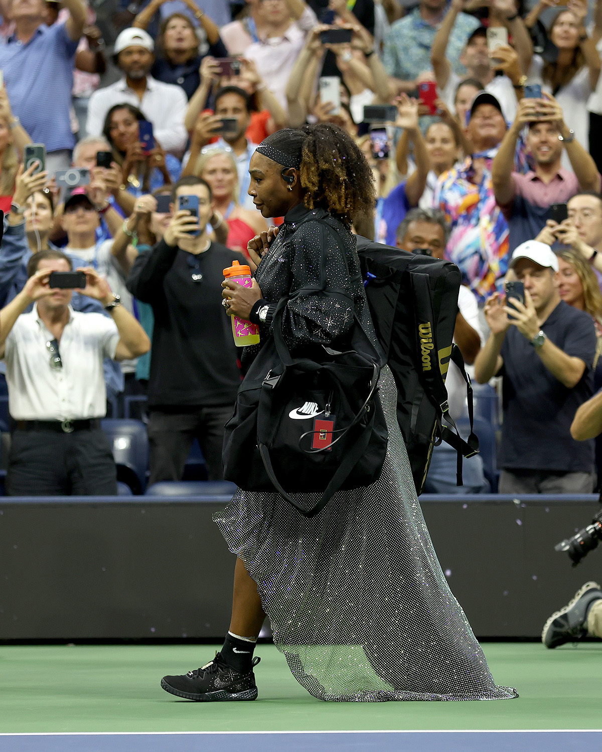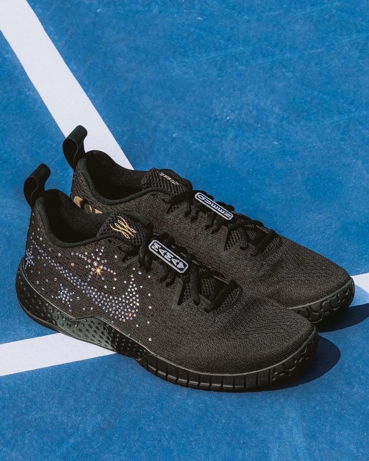 Serena Williams portait une robe Nike inspirée du patinage artistique, comme le rapporte le journaliste sportif Nick de Paula. Elle l’a conçue en six couches en référence à ses six titres remportés à Flushing Meadows. Assorties au scintillement de sa robe, ses chaussures NikeCourt Flare 2 étaient incrustées de diamants formant le logo en virgule signature de la marque, ainsi que des motifs étoile. Elle s’offrait le luxe de scintiller jusque dans ses cheveux parsemés de brillants.Sa tenue a également marqué les esprits.