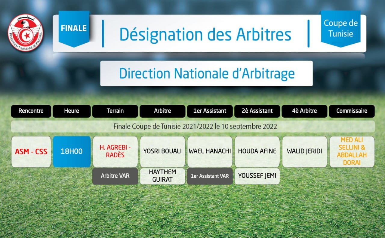 La Fédération Tunisienne de Football a annoncé la désignation de l’arbitre Yousri Bou Ali pour diriger la finale de Coupe de Tunisie, qui se jouera entre l’Avenir de La Marsa et le Club Sportif Sfaxien, samedi, à 18h, au stade Hamadi Agrebi à Rades.