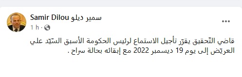 Le juge d’instruction a décidé de reporter l’audition de l’ancien chef du gouvernement, Ali Larayadh au 19 décembre 2022 et de le maintenir en état de liberté, rapporte ce matin l’avocat, Samir Dilou.