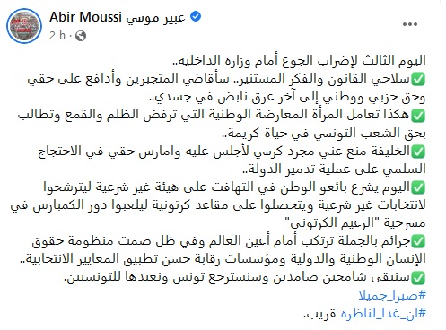 Dans un post paru ce lundi, sur sa page officielle Facebook, Moussi écrit que '' les traitres à la nation commencent à affluer, aujourd’hui, vers une instance illégale en vue de se porter candidats à des élections illégales et obtenir des sièges en carton, pour jouer le rôle de comparses dans une pièce de théâtre ''.