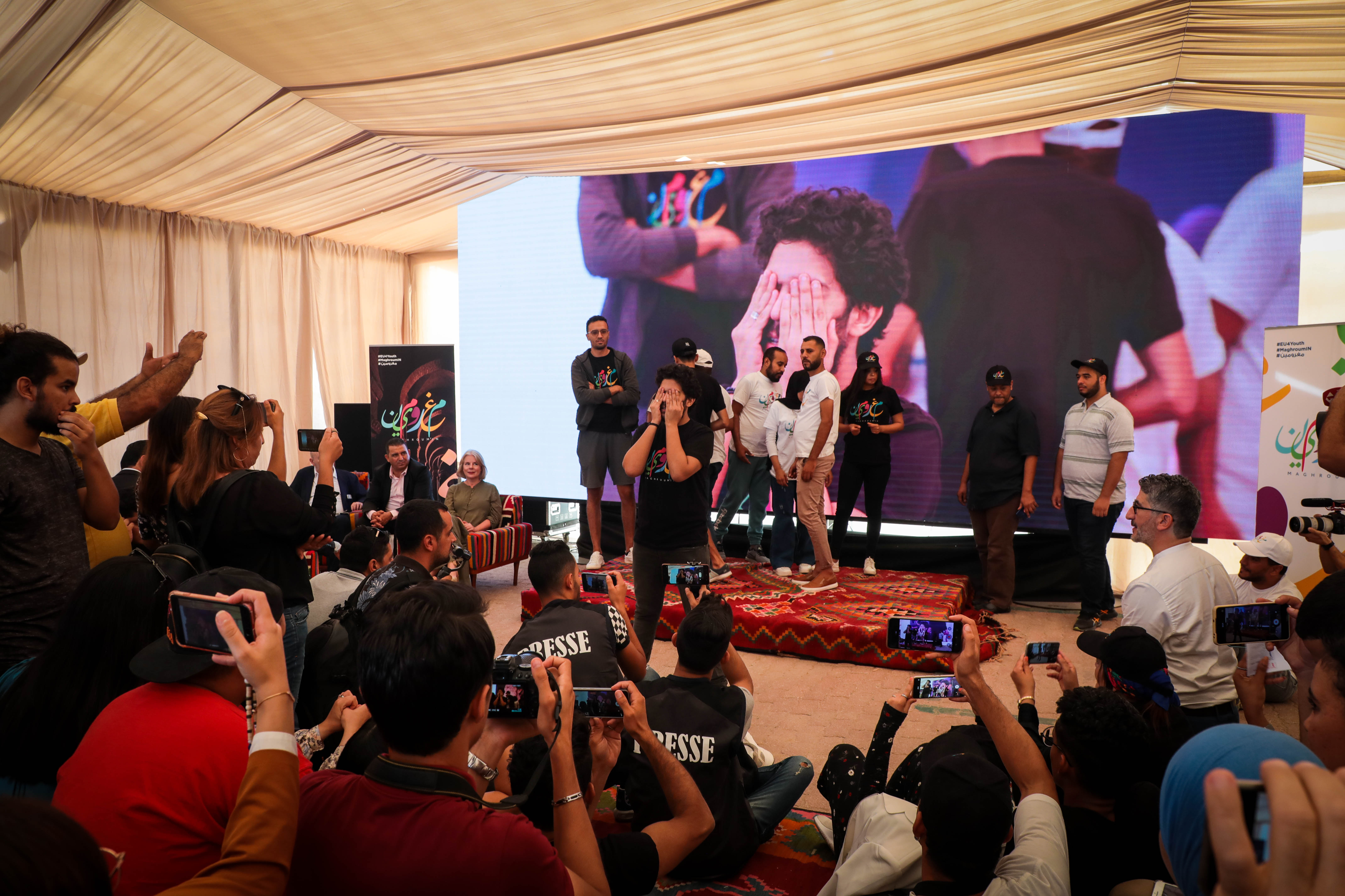 A l’occasion du lancement de ce projet « Maghroumin » des groupes de jeunes passionnés d'art, de culture et de sport sont venus en des 24 gouvernorats tunisiens pour exprimer leurs soif de vie ,leurs idées et visions , ainsi que pour soumettre leurs propositions et porter leurs revendications.