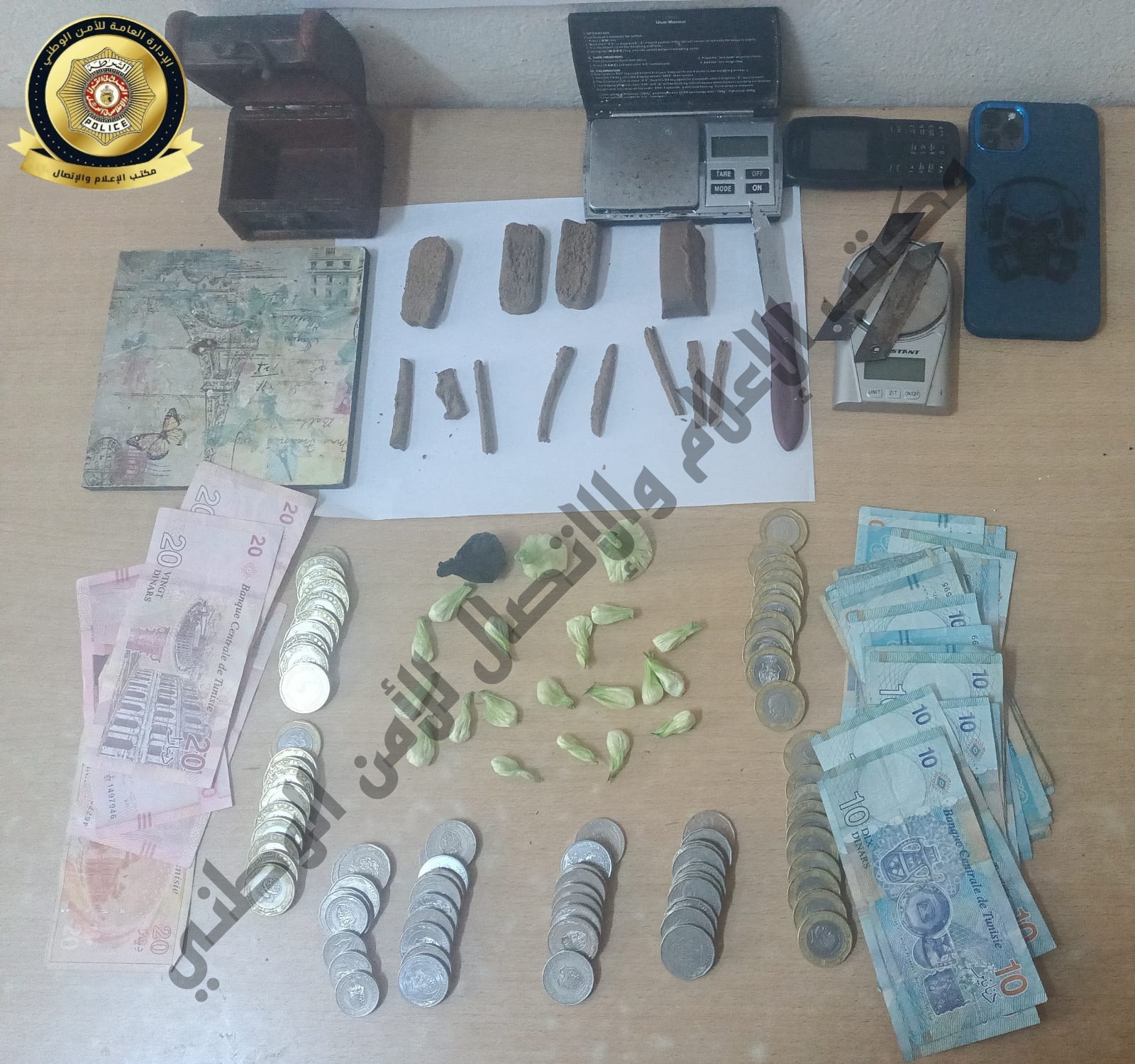 Après coordination avec le parquet, une descente a été effectuée dans ledit domicile, 12 plaques de cannabis, de formes variables, ont été saisies, ainsi que 12 capsules de cocaïne, et une somme estimée à 590 dinars.