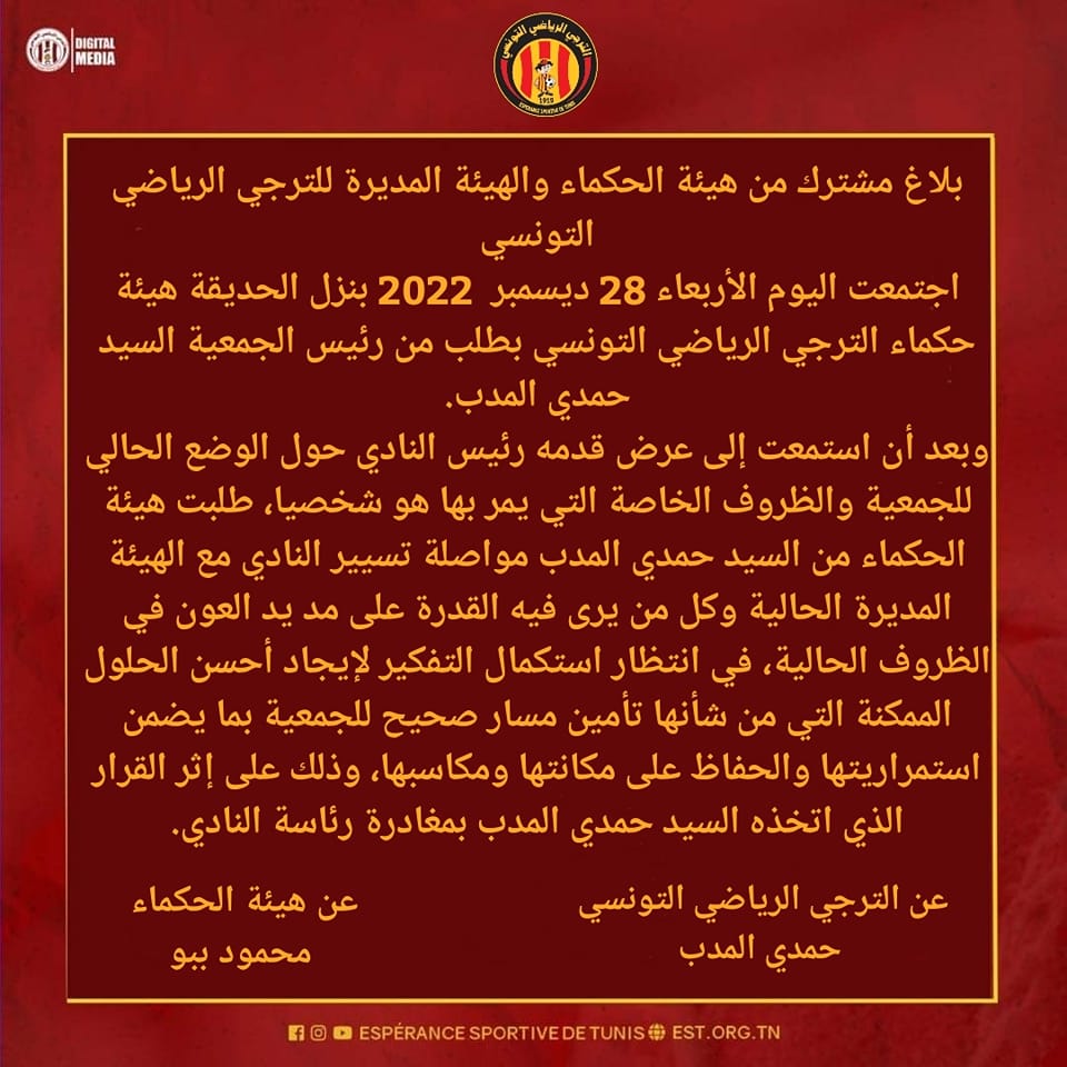 L’Espérance Sportive de Tunis ne peut pas se passer, actuellement, de son président Hamdi Meddeb. C’est ce qu’a estimé le comité des sages des Sang et or, qui se sont réunis ce mercredi. Dans un communiqué publié par le site officiel du club, le comité a demandé au président de rester à son poste en compagnie de « tous ceux qui peuvent prêter main forte » dans ces conditions difficiles.