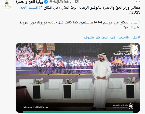 Lors de la cérémonie d’ouverture de l’Expo Hajj, ayant démarré lundi à Djeddah et se poursuit au 12 janvier, autour des services rendus aux pèlerins, il a indiqué que ''les effectifs des pèlerins au cours de la saison de l’an 1444 de l’hégire, retrouveront les mêmes niveaux, que ceux d’avant la pandémie du covid, sans limites d’âge ''.