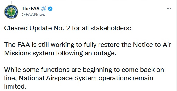 La FAA travaille toujours pour restaurer complètement le système de notification aux pilotes, suite à la panne, souligne-t-elle dans un tweet.